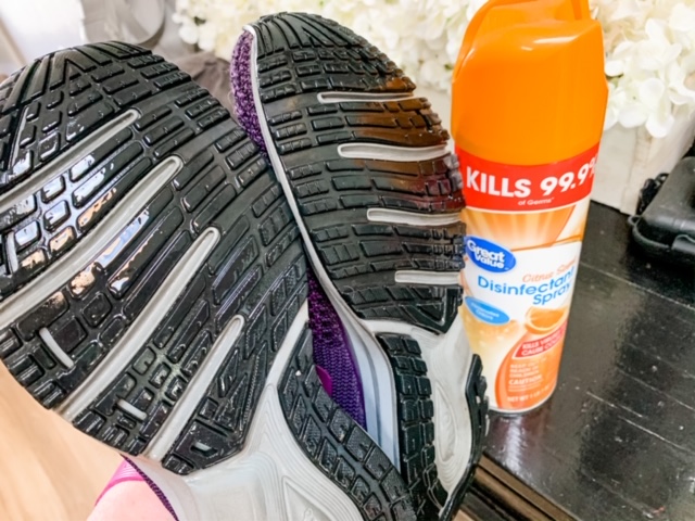 Then I flip them over and spray the bottoms with a disinfecting spray, like Lysol. Unfortunately, finding Lysol spray in the store or online is pretty hard right now. So when my can runs empty, I will be making my own disinfecting spray. I’ve done it before, and it’s really easy.