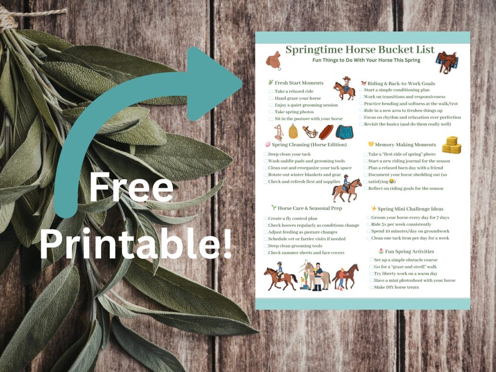Click here to get your own copy of my SPRINGTIME HORSE BUCKET LIST. Then print it off from your printer and check off each item as you do it with your horse this spring. Because summer will be here before we know it, and I want you and your horse to be ready for many, many adventures this summer!