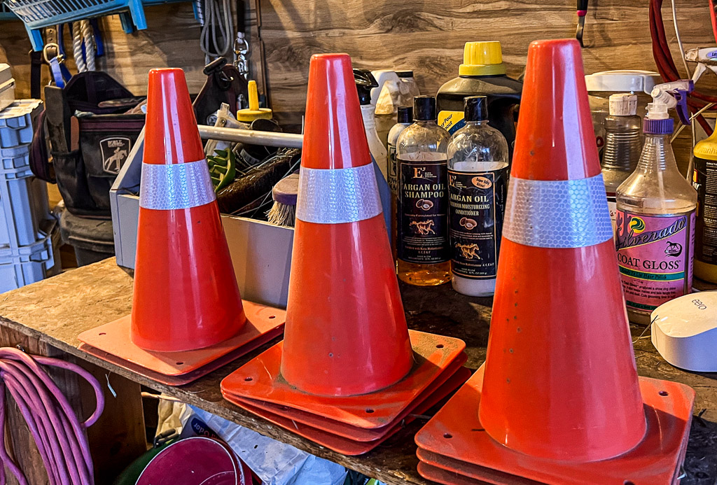 Did you know Dollar Tree sells orange cones? I’m not talking about the small ones. I’m talking about ones that are large enough to use in your arena that you can see. And if you are getting ready to work some dressage, you can DIY a dressage arena with these cones. You just need to add the letters to the cones. I have one-upped myself with mine because I put them on top of my square supplement containers, which raise them off the ground even higher.