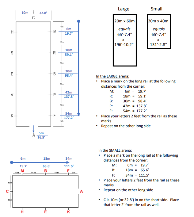 If you want to set up your own dressage arena, hopefully, the image above will give you an idea of the space you will need to make one. I found it very helpful to make sure I had the letters where they needed to go. And because I am not very good with the metric system, I have included the measurements in feet as well.