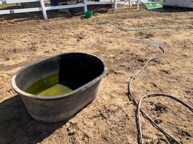 I don’t use fancy cleaners, just a scrub brush, and some liquid dish soap. Mrs. Meyers is my favorite. And after a lot of scrubbing, presto! I have a clean water tank, and my horses have a clean water source. Now, if I can just keep it this way!